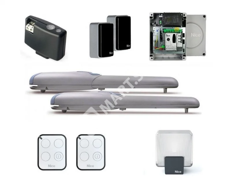 NICE WINGO5024BDKCE — комплект автоматики для распашных ворот с линейными электромеханическими приводами 24 В, рассчитанный на створки до 3,5 м и примерно до 200 кг на створку. Решение ориентировано на тихую и надежную работу, удобный монтаж и расширенный функционал управления благодаря центральному блоку MC424L с bidirectional‑радио. Комплект включает фотодатчики, светосигнальную LED‑лампу и два брелока ON3EBD для оперативного управления.
