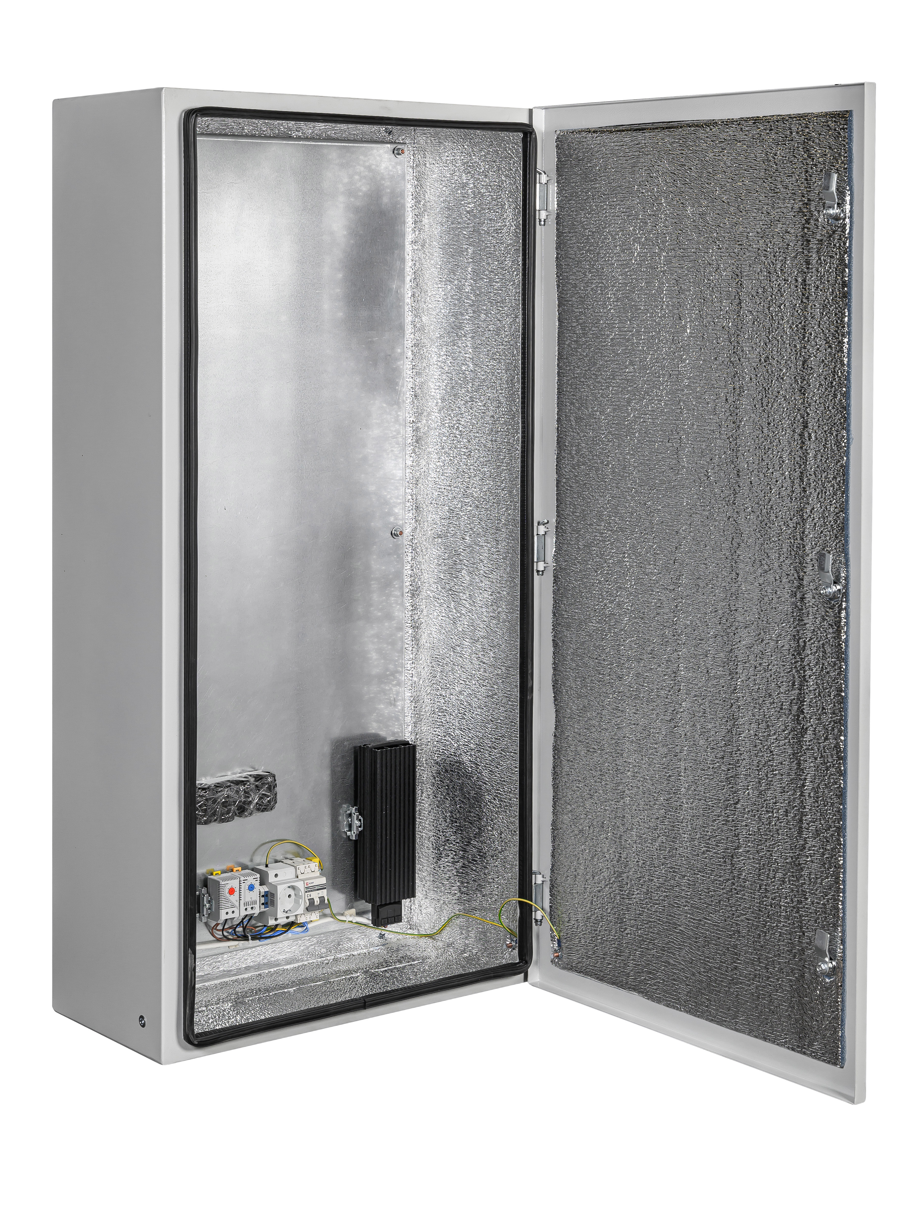утеплитель из порилекса, замок 2 шт, ключ 1 шт, монтажная плата 1шт, гермовводы 5 шт (MG-25), розетка 1 шт, автоматический выключатель, 6А 1шт, клемма для подключения оборудования 2 шт, клемма заземления 1 шт, термореле 1шт, реле предстарта 1 шт, нагреватель мощностью 150 Вт 2 шт.