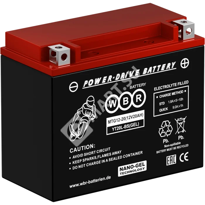 Герметизированные, выполненные по гелевой технологии (GEL), стартерные мотоциклетные свинцово-кислотные аккумуляторы WBR MTG12-20 обладают высоким качеством и надежностью. Эти аккумуляторные батареи успешно выдерживают конкуренцию со стартерными батареями этого класса других производителей, соответствуют техническим характеристикам и являются аналогом мотоциклетных аккумуляторных батарей YUASA серии YT20L-BS. Они предназначены для работы приборов и пусковых механизмов на мотоциклах, скутерах, гидроциклах, квадроциклах, снегоходах и мотовездеходах.
