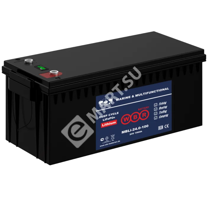 Аккумулятор WBR Marine серии MBLi24-100 - литиевая (литий железо фосфатные LiFePO4), герметизированная, лодочная аккумуляторная батарея. Обладает высоким качеством и надежностью, высокой цикличностью использования, устойчивы к глубоким разрядам и применяются для питания на яхтах, катерах и моторных лодках. Возможно применение как источников питания для электронасосов, эхолотов, осветительных приборов и другого вспомогательного оборудования. Обладают в 20 раз большей цикличностью и большим сроком службы, чем свинцово-кислотные аккумуляторы, что помогает минимизировать затраты на замену и снизить общую стоимость владения. Аккумулятор MBLi24-100 вдвое мощнее, имеет более высокую скорость разряда, сохраняя при этом высокую энергетическую емкость, на 60% легче аналогичной свинцово-кислотной батареи. Превосходная безопасность: химия фосфата лития железа исключает риск взрыва или горения из-за сильного удара, перезаряда или короткого замыкания.
